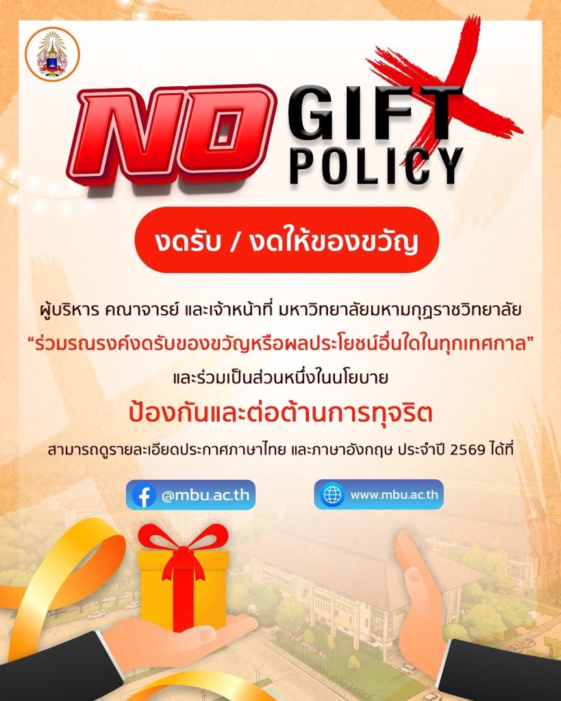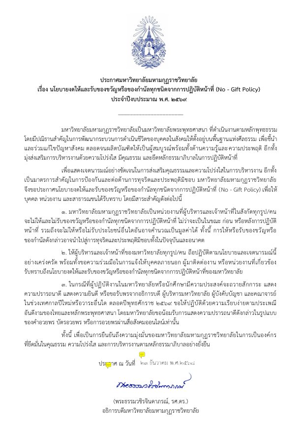 มหาวิทยาลัยมหามกุฏราชวิทยาลัย ร่วมรณรงค์งดรับของขวัญหรือผลประโยชน์อื่นใดในทุกเทศกาล และร่วมเป็นส่วนหนึ่งในนโยบาย ป้องกันและต่อต้านการทุจริตBy Sutthirak Kanlaya / 25 ธันวาคม 2025