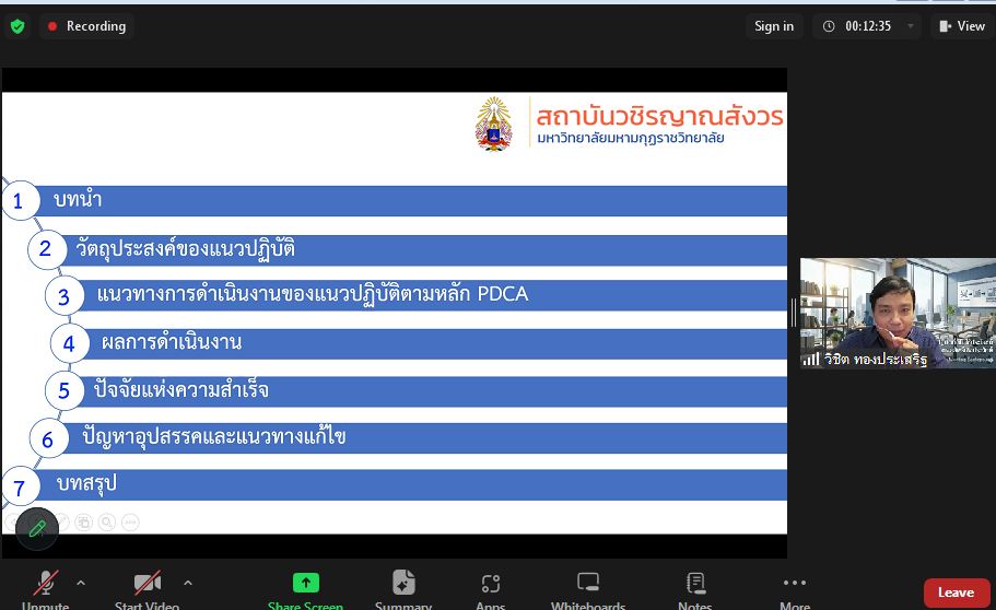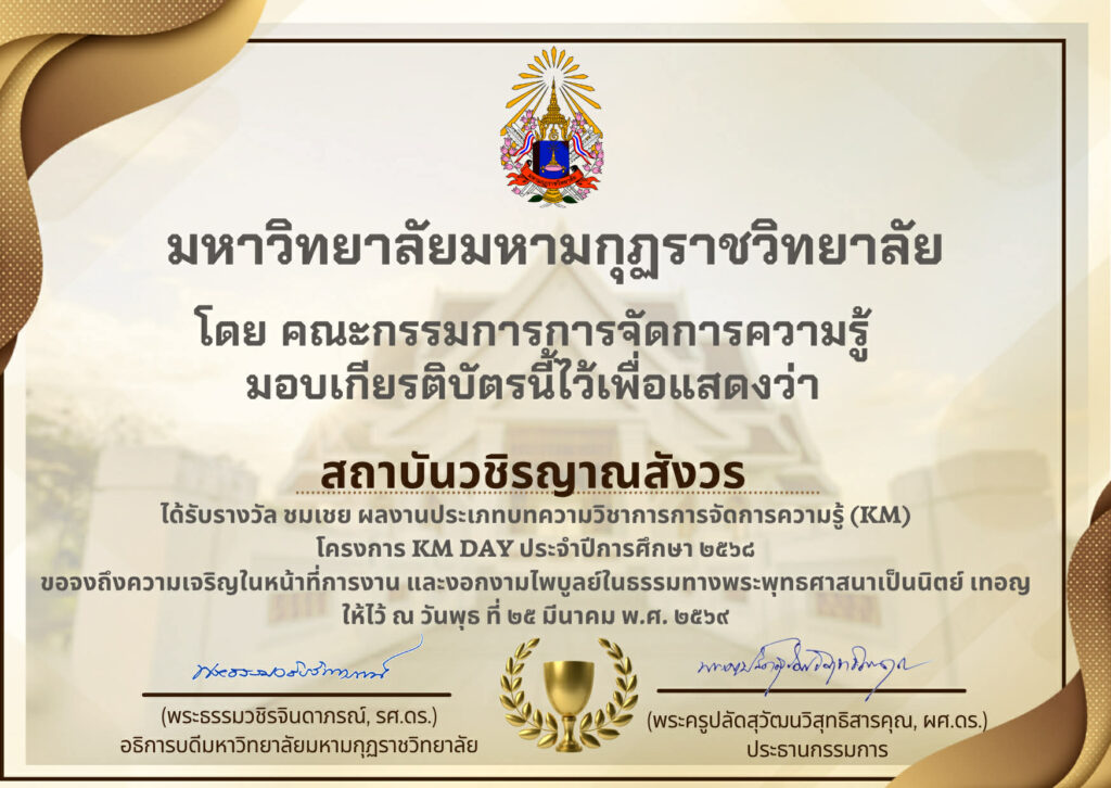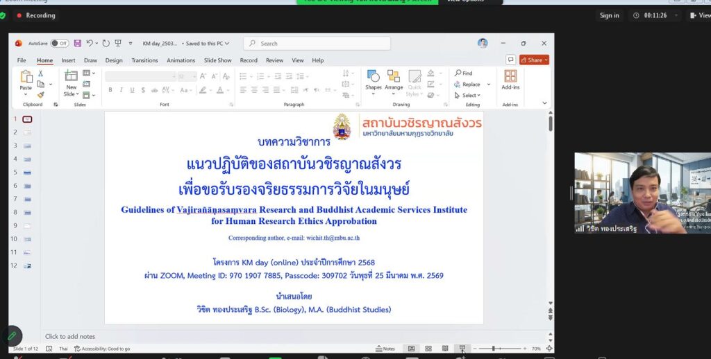 วันพุธที่ ๒๕ มีนาคม พ.ศ. ๒๕๖๙ นายวิชิต ทองประเสริฐ ผู้แทนสถาบันวชิรญาณสังวร ได้นำเสนอบทความวิชาการ เรื่อง แนวปฏิบัติของสถาบันวชิรญาณสังวร เพื่อขอรับรองจริยธรรมการวิจัยในมนุษย์ โครงการ KM day (online) ผ่านระบบออนไลน์ และได้รับรางวัลชมเชย