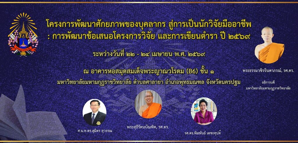 ข่าวประชาสัมพันธ์สถาบันวชิรญาณสังวร จัดอบรมเชิงปฏิบัติการโครงการพัฒนาศักยภาพของบุคลากร สู่การเป็นนักวิจัยมืออาชีพ: การพัฒนาข้อเสนอโครงการวิจัย และการเขียนตำรา ปี ๒๕๖๙ระหว่างวันที่ ๒๒ – ๒๔ เมษายน พ.ศ. ๒๕๖๙ณ อาคารหอสมุดสมเด็จพระญาณวโรดม (B6) ชั้นที่ ๑ มหาวิทยาลัยมหามกุฏราชวิทยาลัย ตำบลศาลายา อำเภอพุทธมณฑล จังหวัดนครปฐม Sutthirak Kanlaya / 20 เมษายน 2026