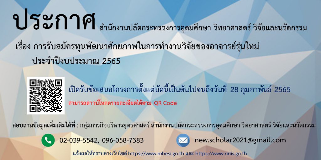 ข่าวประชาสัมพันธ์สป.อว. รับข้อเสนอการวิจัย ทุนพัฒนาศักยภาพในการทำงานวิจัยของอาจารย์รุ่นใหม่ ประจำปีงบประมาณ 2565 Sutthirak Kanlaya / 11 กุมภาพันธ์ 2022 สป.อว. จึงมีความประส […]