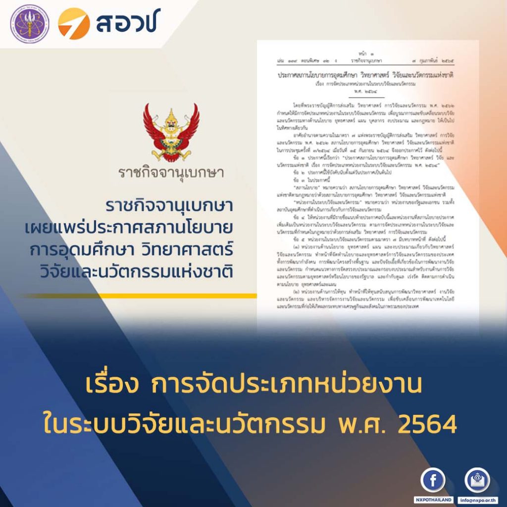 ข่าวประชาสัมพันธ์ประกาศสภานโยบายการอุดมศึกษา วิทยาศาสตร์ วิจัยและนวัตกรรมแห่งชาติ เรื่อง การจัดประเภทหน่วยงานในระบบวิจัยและนวัตกรรม พ.ศ. 2564 ลงวันที่ 17 พฤศจิกายน พ.ศ. 2564 Sutthirak Kanlaya / 8 กุมภาพันธ์ 2022 ราชกิจจานุเบกษา เมื่