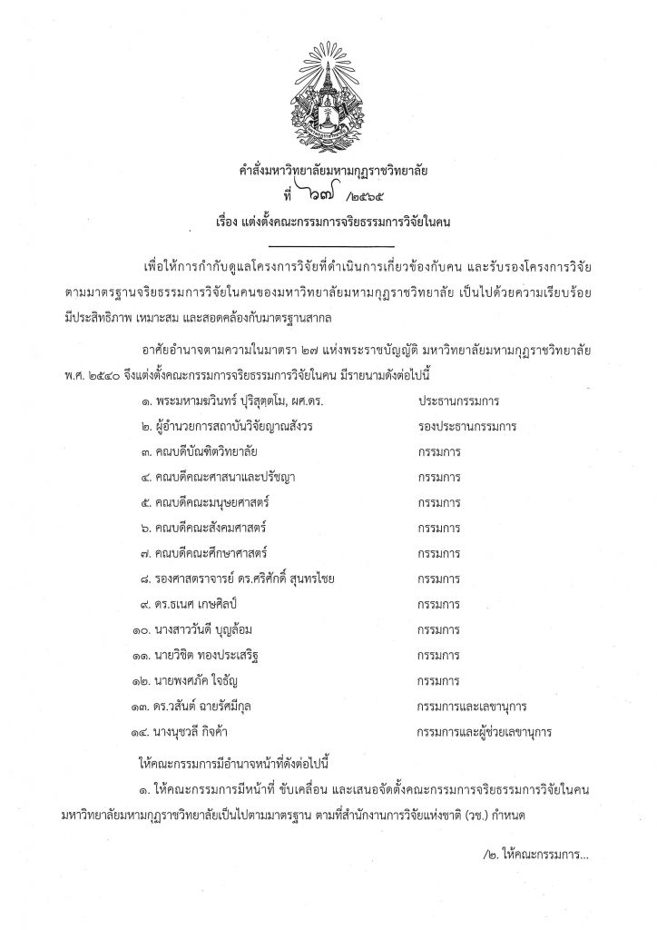 ประกาศ/คำสั่งคำสั่งมหาวิทยาลัยมหามกุฏราชวิทยาลัย ที่ ๖๗/๒๕๖๕ เรื่อง แต่งตั้งคณะกรรมการจริยธรรมการวิจัยในคน Sutthirak Kanlaya / 8 กุมภาพันธ์ 2022 เพื่อให้การกำกับดูแล