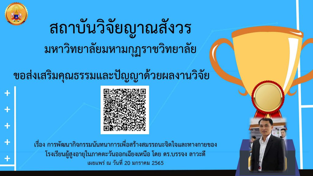 ผลงานวิจัยการพัฒนากิจกรรมนันทนาการเพื่อสร้างสมรรถนะจิตใจและทางกายของโรงเรียนผู้สูงอายุในภาคตะวันออกเฉียงเหนือ Sutthirak Kanlaya / 20 มกราคม 2022 ดร.บรรจง ลาวะลี