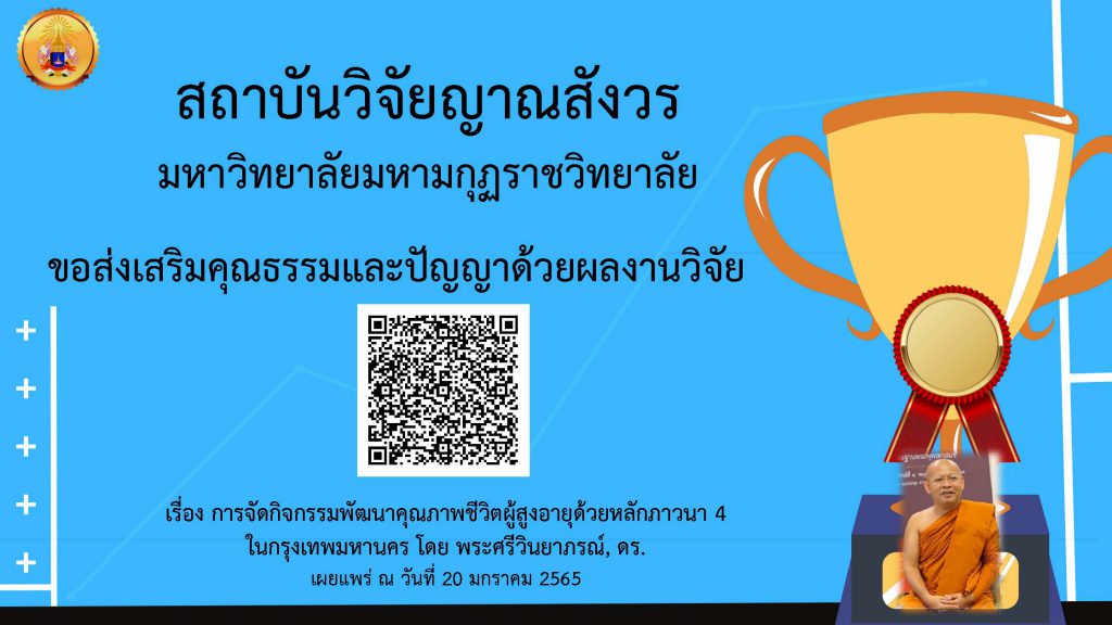 ผลงานวิจัยการจัดกิจกรรมพัฒนาคุณภาพชีวิตผู้สูงอายุด้วยหลักภาวนา 4 ในกรุงเทพมหานคร Sutthirak Kanlaya / 20 มกราคม 2022 พระศรีวินยาภรณ์, ดร.