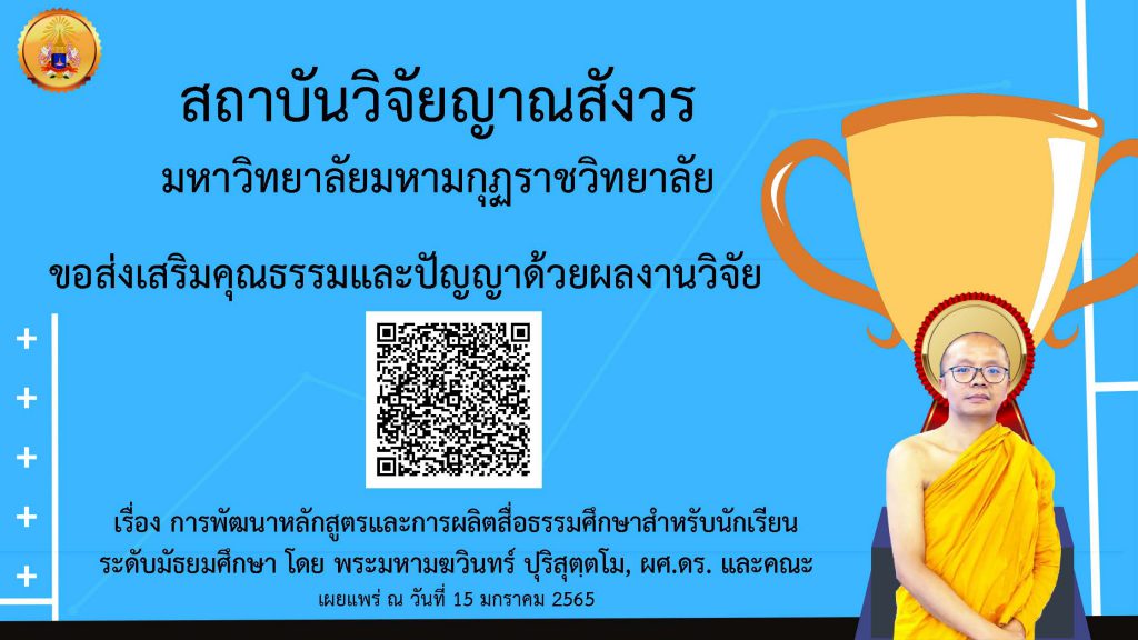 ผลงานวิจัยการพัฒนาหลักสูตรและการผลิตสื่อธรรมศึกษา สำหรับนักเรียนระดับมัธยมศึกษา Sutthirak Kanlaya / 14 มกราคม 2022 พระมหามฆวินทร์ ปุริส
