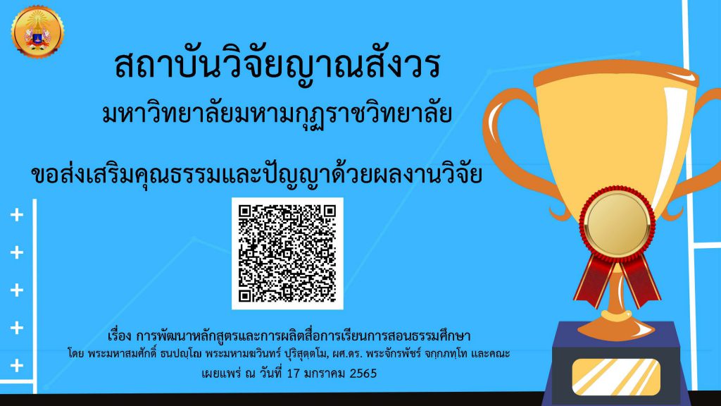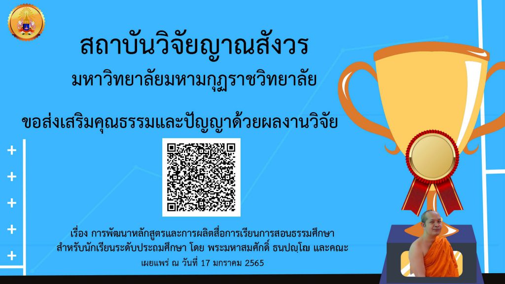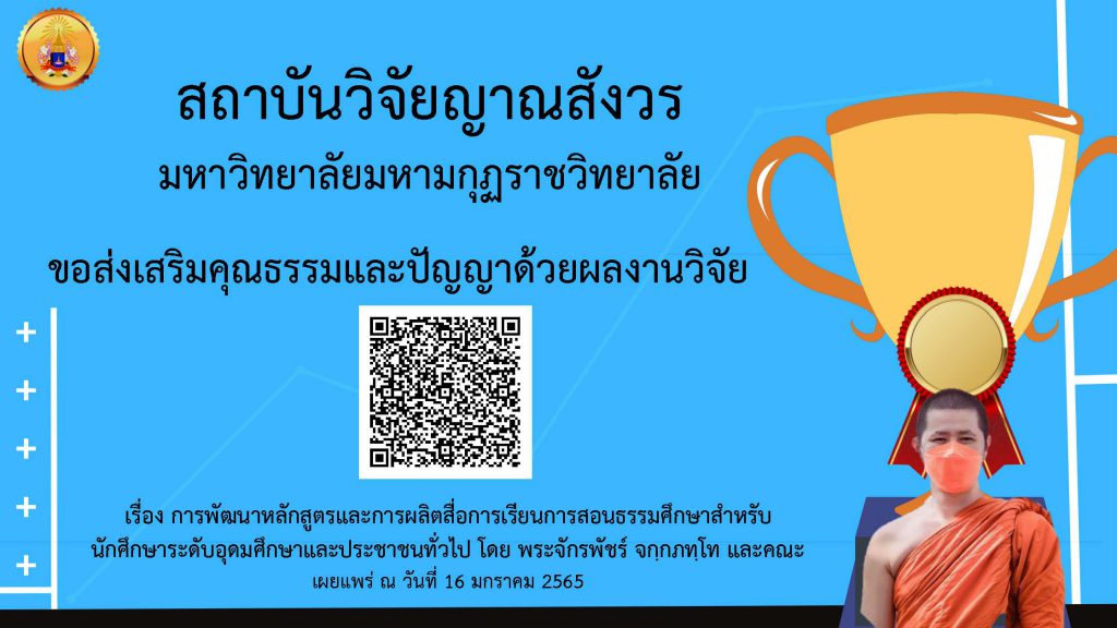 ผลงานวิจัยการพัฒนาหลักสูตรและการผลิตสื่อการเรียนการสอนธรรมศึกษาสำหรับนักศึกษาระดับอุดมศึกษาและประชาชนทั่วไป Sutthirak Kanlaya / 16 มกราคม 2022 พระจักรพัชร์ จกฺกภทฺ