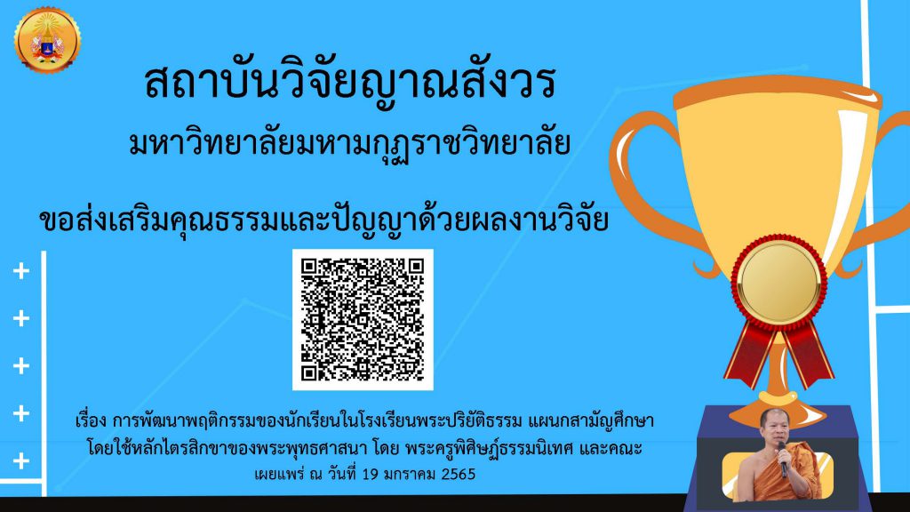 ผลงานวิจัยการพัฒนาพฤติกรรมของนักเรียนในโรงเรียนพระปริยัติธรรม แผนกสามัญศึกษาโดยใช้หลักไตรสิกขาของพระพุทธศาสนา Sutthirak Kanlaya / 19 มกราคม 2022 พระครูพิศิษฏ์ธรรมนิเ