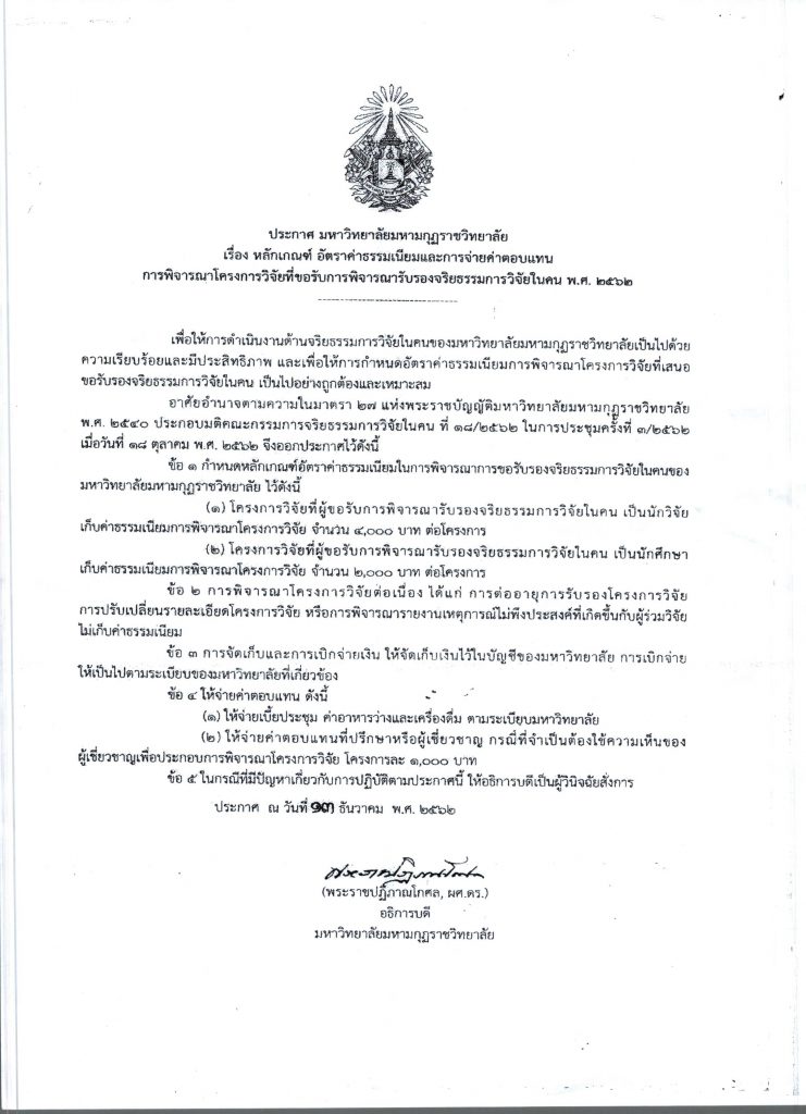 ประกาศ/คำสั่งประกาศ หลักเกณฑ์ อัตราค่าธรรมเนียมและการจ่ายค่าตอบแทนการพิจารณาโครงการวิจ้ยที่ขอรับการพิจารณารับรองจริยธรรมการทำวิจัยในคน 2563 jetsada / 14 ธันวาคม 2019
