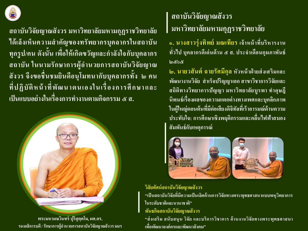 ข่าวสารกิจกรรมสถาบันวิจัยญาณสังวร มหาวิทยาลัยมหามกุฏราชวิทยาลัย ยกย่องและแสดงความยินดีกับบุคลากร Sutthirak Kanlaya / 28 กุมภาพันธ์ 2022 สถาบันวิจัยญาณสังวร