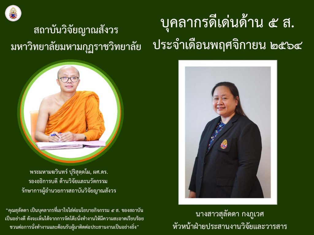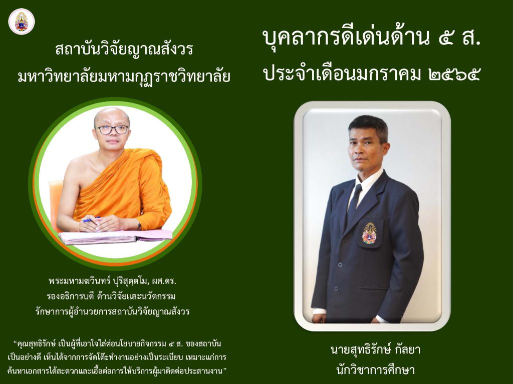 ข่าวสารกิจกรรมบุคลากรดีเด่นด้าน ๕ ส. ประจำเดือนพฤศจิกายน ๒๕๖๔ Sutthirak Kanlaya / 4 กุมภาพันธ์ 2022 หลังจากที่สถาบันวิจั