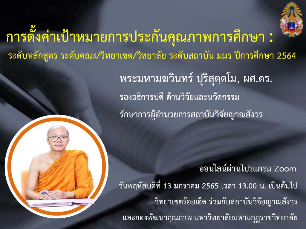 ข่าวสารกิจกรรมสถาบันวิจัยญาณสังวร ร่วมกับวิทยาเขตร้อยเอ็ดและกองพัฒนาคุณภาพ จัดสัมมนาทางวิชาการเรื่อง “การต้้งค่าเป้าหมายการประกันคุณภาพการศึกษา : ระดับหลักสูตร ระดับคณะ/วิทยาเขต/วิทยาลัย และระดับสถาบัน ปี ๒๕๖๔” Sutthirak Kanlaya / 7 มกราคม 2022 วันพฤหัสบดีที่ ๑๓ มก
