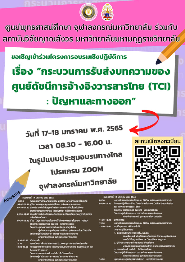 ข่าวสารกิจกรรมสถาบันวิจัยญาณสังวร มมร จัดอบรมวิชาการพัฒนาวารสารตามเกณฑ์ tci ร่วมกับศูนย์พุทธศาสน์ศึกษา จุฬาลงกรณ์มหาวิทยาลัย Sutthirak Kanlaya / 5 มกราคม 2022 วันที่ ๑๗-๑๘ มกราคม