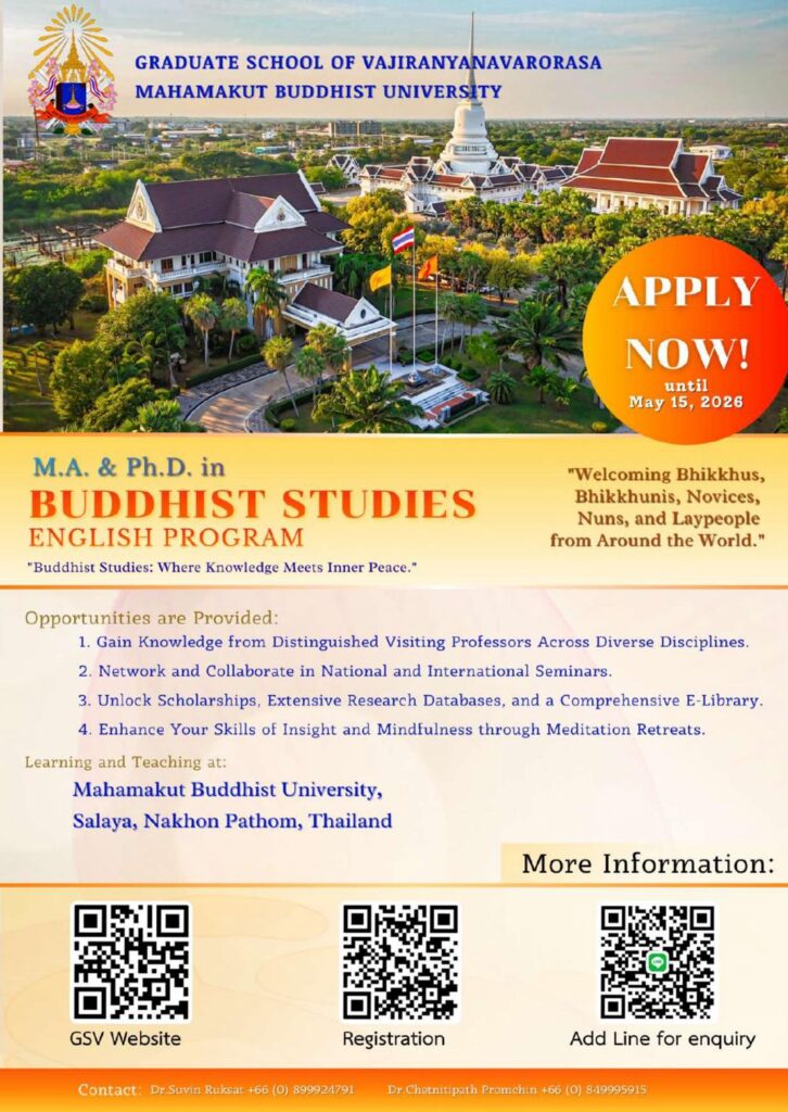 ข่าวประชาสัมพันธ์บัณฑิตวิทยาลัยวชิรญาณวโรรส เปิดรับสมัครหลักสูตรระดับบัณฑิตศึกษา สาขาวิชาพุทธศาสน์ศึกษาภาคภาษาอังกฤษ (English Program) Sutthirak Kanlaya / 16 เมษายน 2026 ประชาสัมพันธ์ “เปิดร