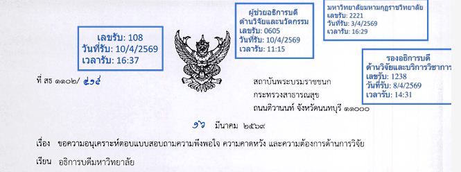 ข่าวประชาสัมพันธ์สถาบันพระบรมราชชนก กระทรวงสาธารณสุข ขอความอนุเคราะห์ตอบแบบสอบถาม ความพึงพอใจ ความคาดหวัง และความต้องการด้านการวิจัย Sutthirak Kanlaya / 16 เมษายน 2026