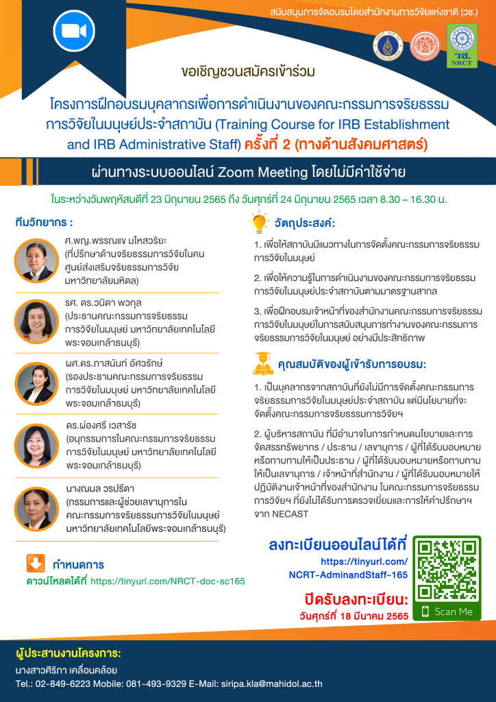 ข่าวประชาสัมพันธ์โครงการฝึกอบรมบุคลากรเพื่อการดำเนินงานของคณะกรรมการจริยธรรมการวิจัยในมนุษย์ โดย มหาวิทยาลัยมหิดลและเครือข่าย Sutthirak Kanlaya / 28 กุมภาพันธ์ 2022 โครงการฝึกอบรมบุคลาก