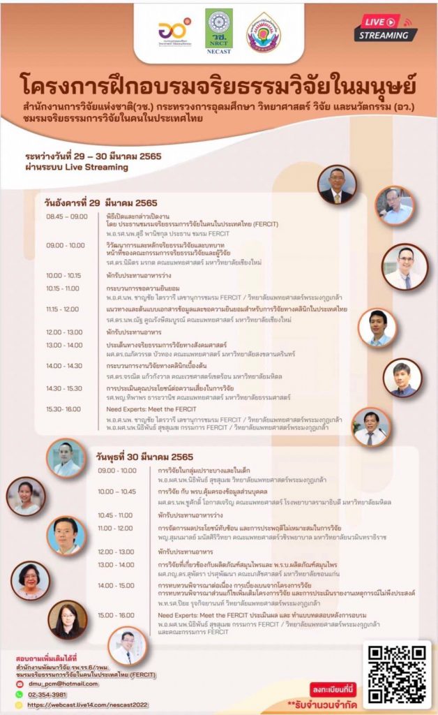ข่าวประชาสัมพันธ์โครงการฝึกอบรมจริยธรรมวิจัยในมนุษย์ โดย สำนักงานการวิจัยแห่งชาติ (วช.) และเครือข่าย Sutthirak Kanlaya / 28 กุมภาพันธ์ 2022 โครงการฝึกอบรมจริยธร