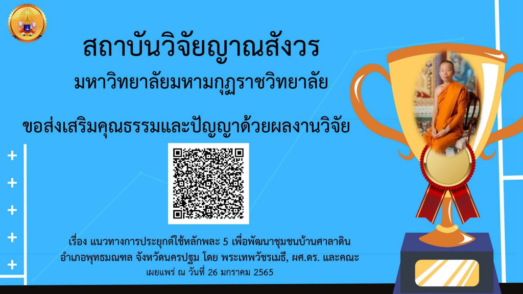 ผลงานวิจัยแนวทางการประยุกต์ใช้หลักพละ 5 เพื่อพัฒนาชุมชนบ้านศาลาดิน อำเภอพุทธมณฑล จังหวัดนครปฐม Sutthirak Kanlaya / 25 มกราคม 2022 พระเทพวัชรเมธี, ผศ.ด