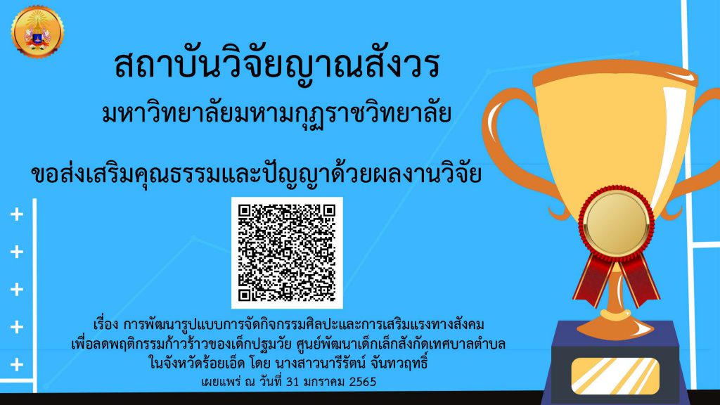 ผลงานวิจัยการศึกษาเนื้อหาและวิธีการสอนวิชาระเบียบวิธีวิจัยระดับมหาบัณฑิต มหาวิทยาลัยมหามกุฏราชวิทยาลัย Sutthirak Kanlaya / 25 มกราคม 2022 รศ.ดร.บุญร่วม คาเมือ