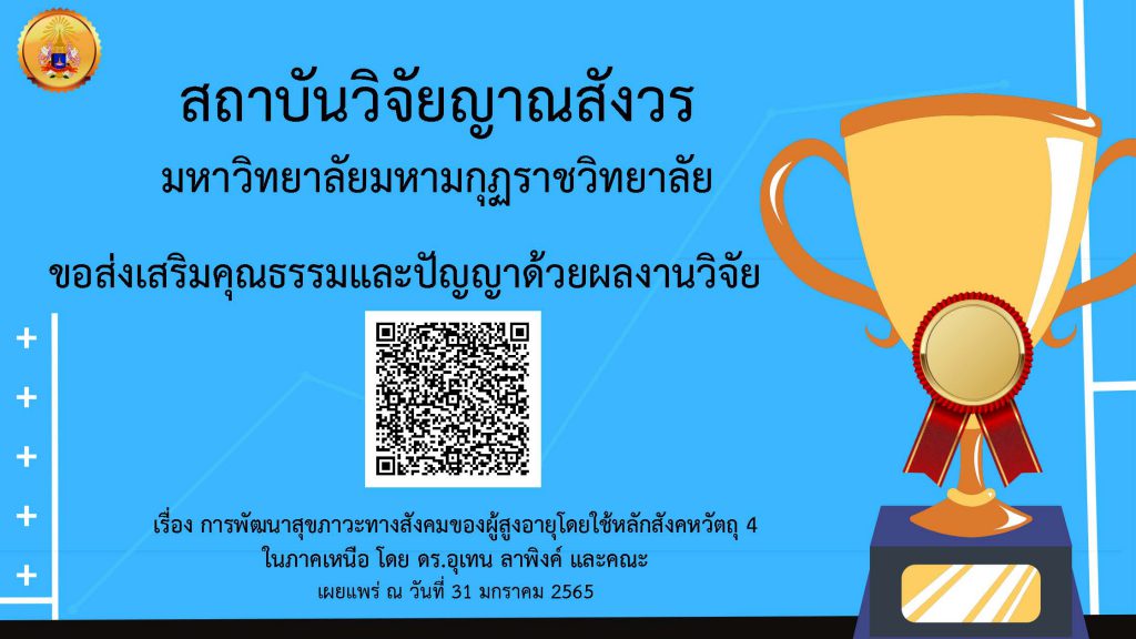 ผลงานวิจัยการพัฒนาสุขภาวะทางสังคมของผู้สูงอายุโดยใช้หลักสังคหวัตถุ 4 ในภาคเหนือ Sutthirak Kanlaya / 31 มกราคม 2022 ดร.อุเทน ลาพิงค์พระค